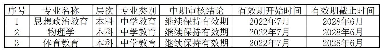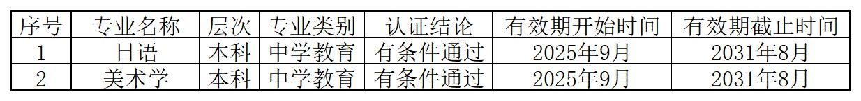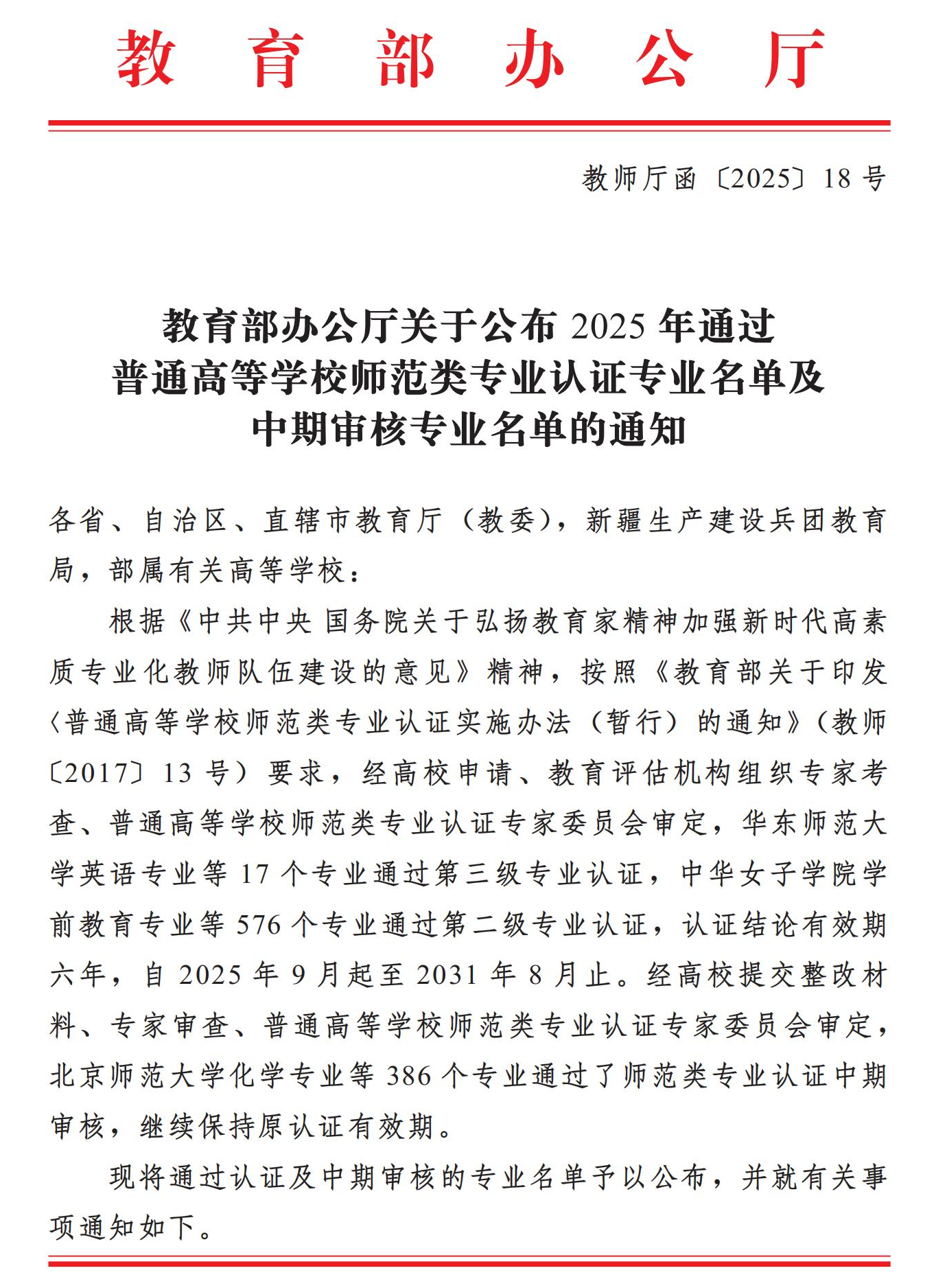 近日,教育部印发《教育部办公厅关于公布2025年通过普通高等学校师范类专业认证专业名单及中期审核专业名单的通知》(教师厅函〔2025〕18号),我校日语、美术学两个专业通过中学教育第二级专业认证,认证结论有效期六年,自2025年9月起至2031年8月止;思想政治教育、物理学、体育教育三个专业通过中期审核,继续保持有效期,自2022年7月起至2028年6月止。截至目前,应参加认证的19个师范类专业全部通过了二级认证。